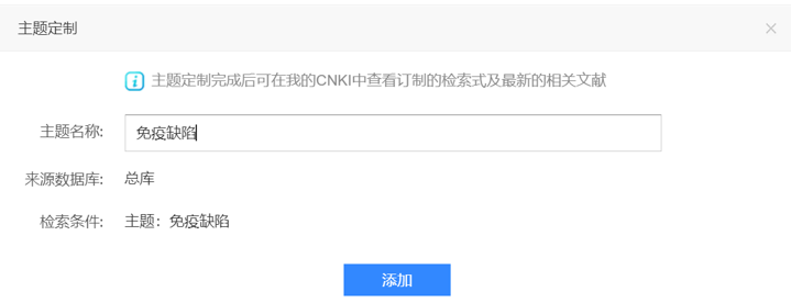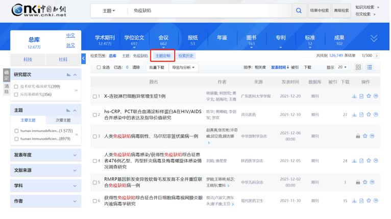 然后在检索出来的文献最上方有一个主题定制,点击主题定制,输入免疫缺陷: