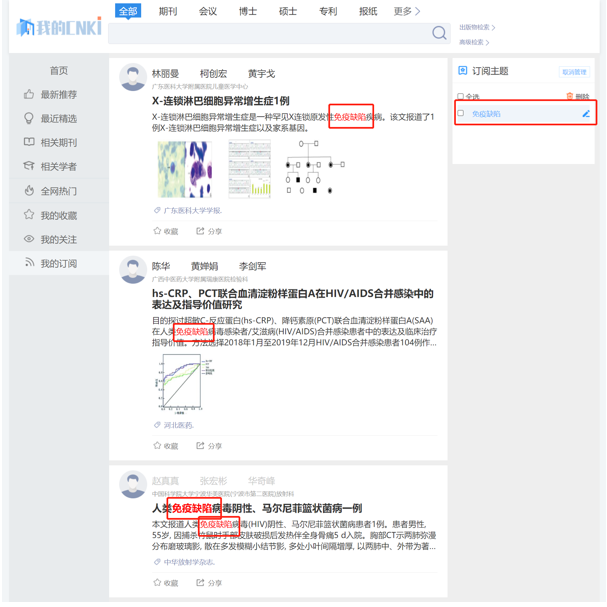 中国知网:说到中国知网,大家一定不陌生,自从某临事件以后,知不知道知网就成了研究生之间相互调侃的一个梗。其实知网不止能用来查文献,它也可以用来订阅相关主题的文献,具体方式如下:打开知网,在搜索框中输入关键词,例如我这里输入“免疫缺陷”: