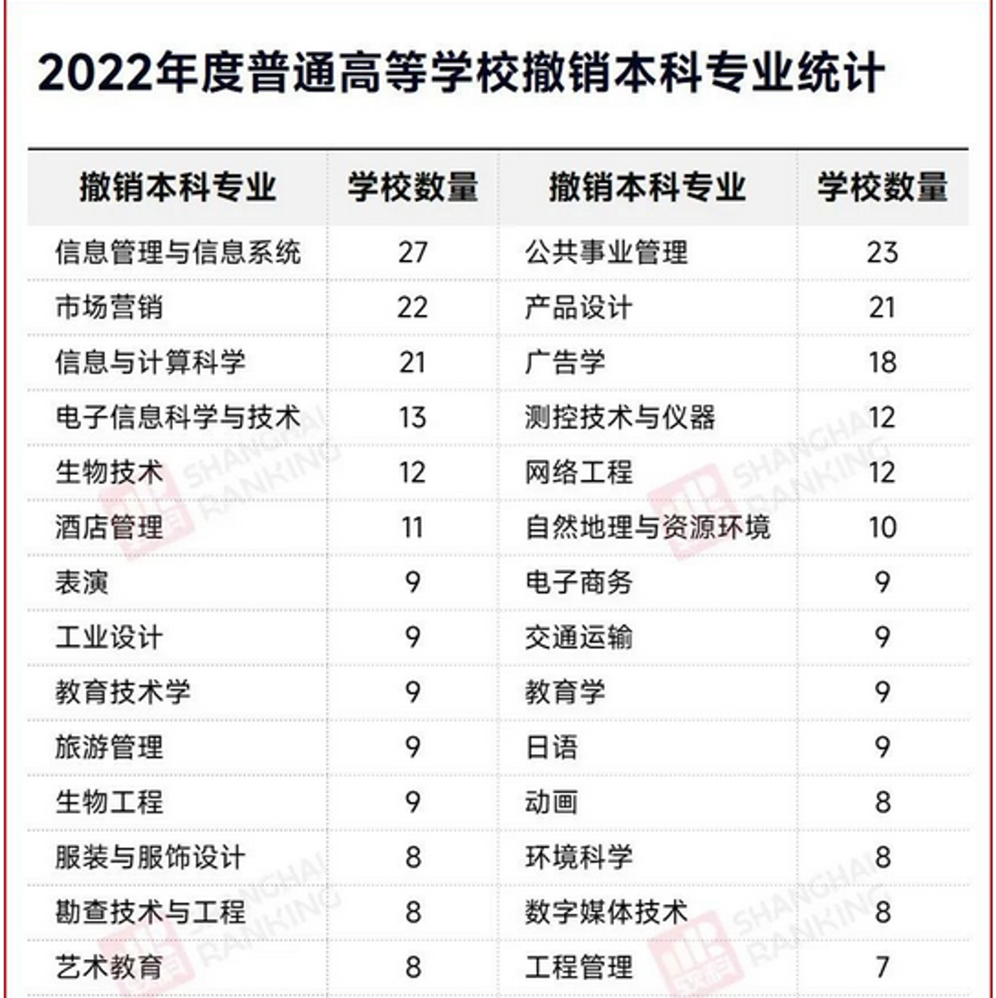 比如2021年撤销了800多个专业,2022年撤销了900多个本科专业。每年教育部的本科专业备案和审批结果,都有一两千个专业变动。下面这张图是2022年撤销专业的情况: