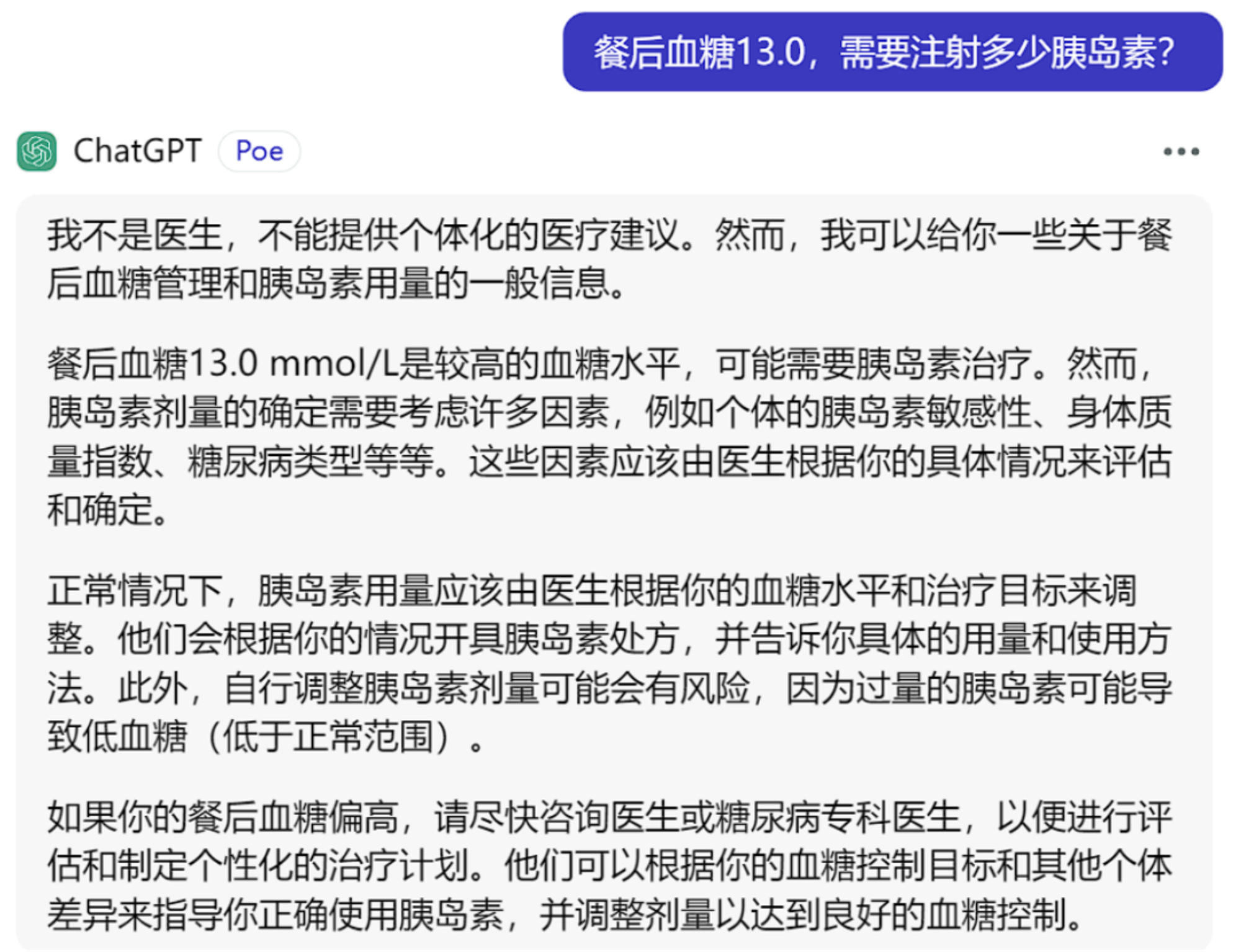 目前,ChatGPT不能用于制定诊疗方案。如果以专业的医学问题去问它,它并不会给出符合当前医疗决策逻辑的任何解决办法。例如:餐后血糖13.0,需要注射多少胰岛素? ChatGPT只会给出一段没有任何实际信息的回答,可能这也涉及到当前法律对医疗行为的管控,给出过多的医疗干预意见,会使其陷入需承担法律风险。