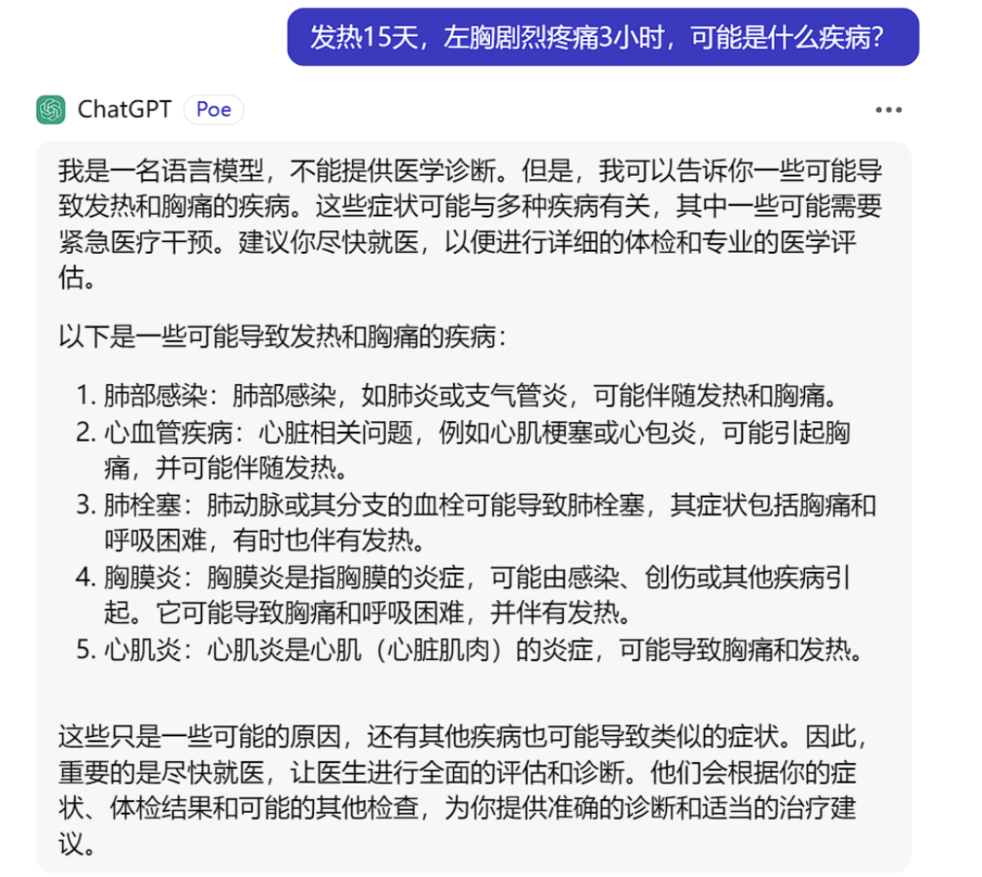 例如,询问具有“发热15天,左胸剧烈疼痛3小时”症状的患者可能患有那种疾病时。ChatGPT会根据关键词发热和胸痛进行检索和列举,但严重不足的是,它会忽略左胸剧烈疼痛3小时这一时间上的危险信号,未对主动脉夹层、心肌梗死等致死性疾病进行提示。ChatGPT的回答没有进行信息上的筛选和重点的选择,其诊断信息并不能满足临床上大病、重病、急病优先排除的医疗逻辑。