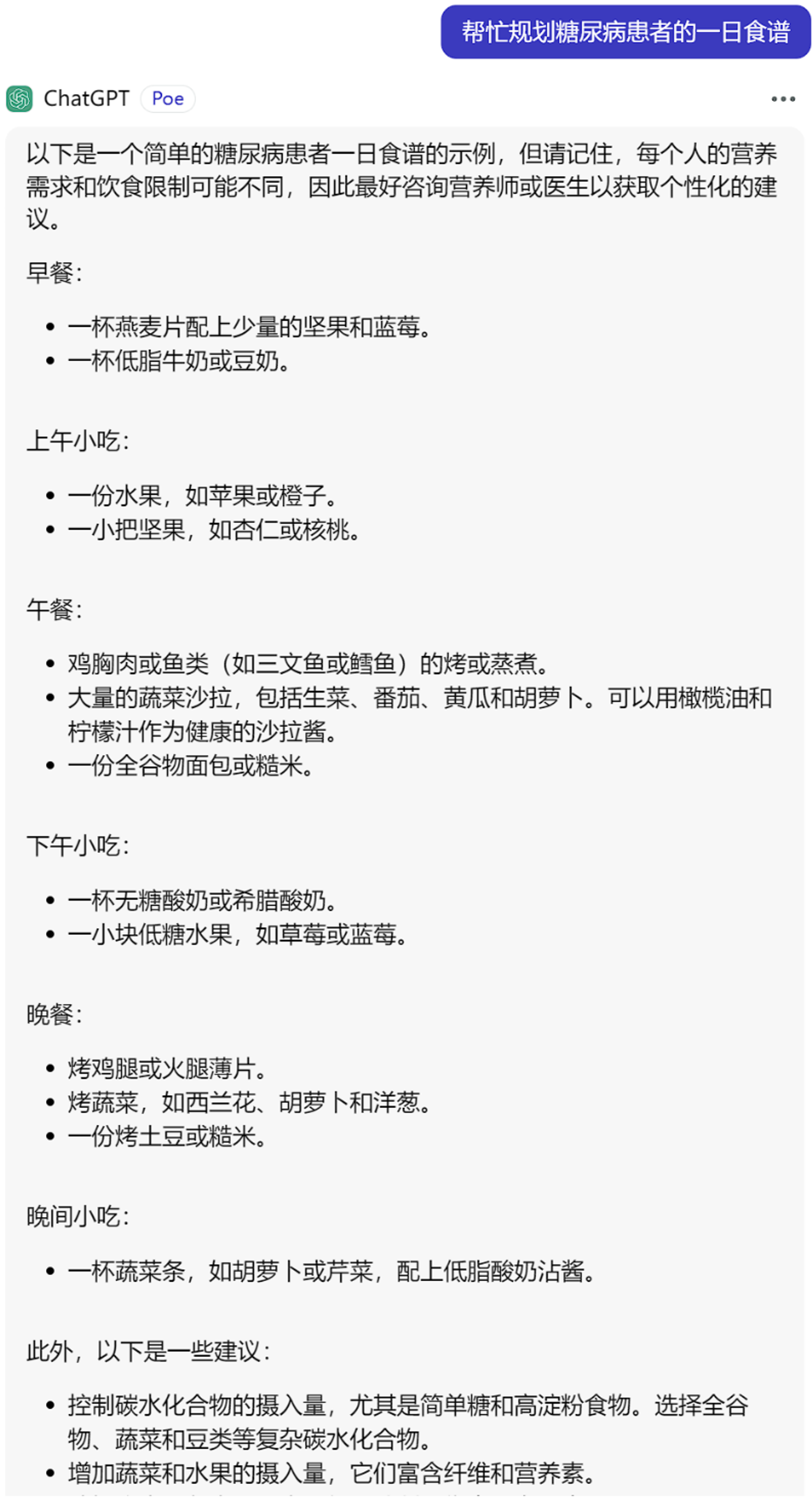 如果举出一个ChatGPT现在就能做的辅助工作,除了老生常谈的科研用途,就数患者教育内容了。把ChatGPT当成一位患者的营养师、生活咨询指南、健康教育者,它能发挥很好的1对1效果。例如,让它为糖尿病患者制定一日食谱,就可以得到一份热气腾腾、温和无害、清淡寡味的减糖减脂食谱。