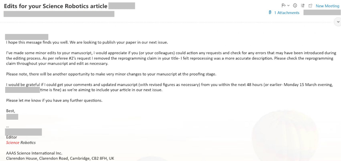 这次润色的稿件7000字左右,最终费用四千出头。我们在提交返修稿之后,论文随即顺利被接收,成为本校发表的第一篇Science Robotics,也算性价比尚可、物有所值的一次体验了。导师已经钦点意得辑为我们后续投子刊的首选润色公司,也推荐给各位科研打工人,少走弯路!