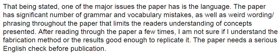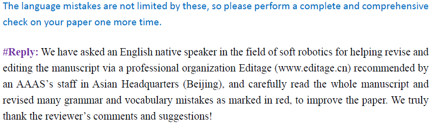 文章投出去后回来的一审意见不算理想,除了科学问题上的原理验证需要补充更多的实验数据,审稿人指出文章的措辞与表达问题很大。“不仅有大量语法和拼写错误,通篇的语言组织得也都不妥当”,已经到了影响读者理解的程度。最后建议我们好好作英语校正。