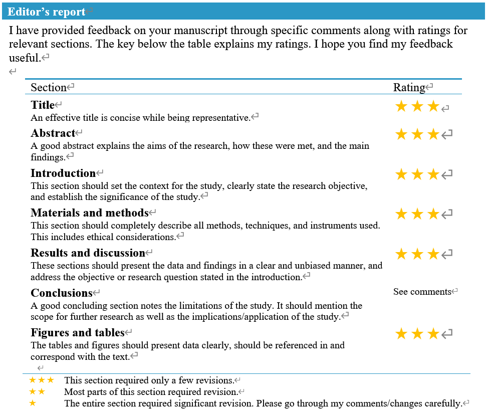 随返稿一起回来的还有编辑的反馈,分别为写作水平和投稿完备度两件事打分。写作水品主要是以英文论文写作的规则审视稿件的各部分,如标题起得是否有水平,引言是否综述充分、且把研究目的及重要性交代得宜,图表数据是否完整、注释与文内文末引用是否一致等等。
