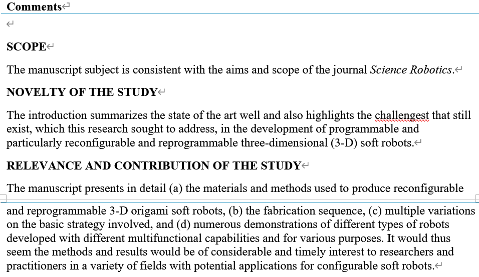 此外,编辑还会针对我所投的期刊Science Robotics,对稿件作另一个维度的评估。包括稿件与目标期刊的匹配度、研究创新性、稿件的突出优势及为什么适合所投期刊。从这些评语可以看出编辑确实具备同领域的专业知识,而她们写下的语句对回复信的撰写也有一定参考性。