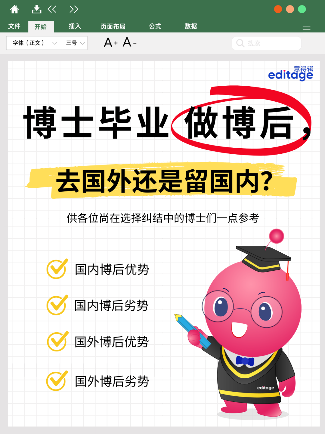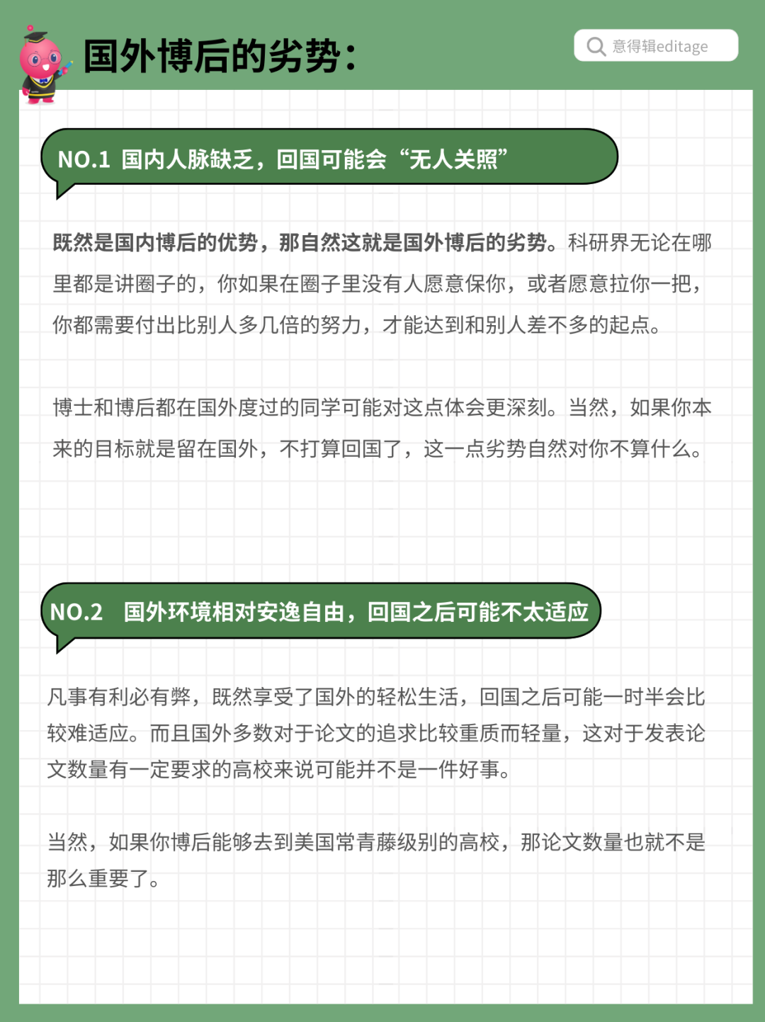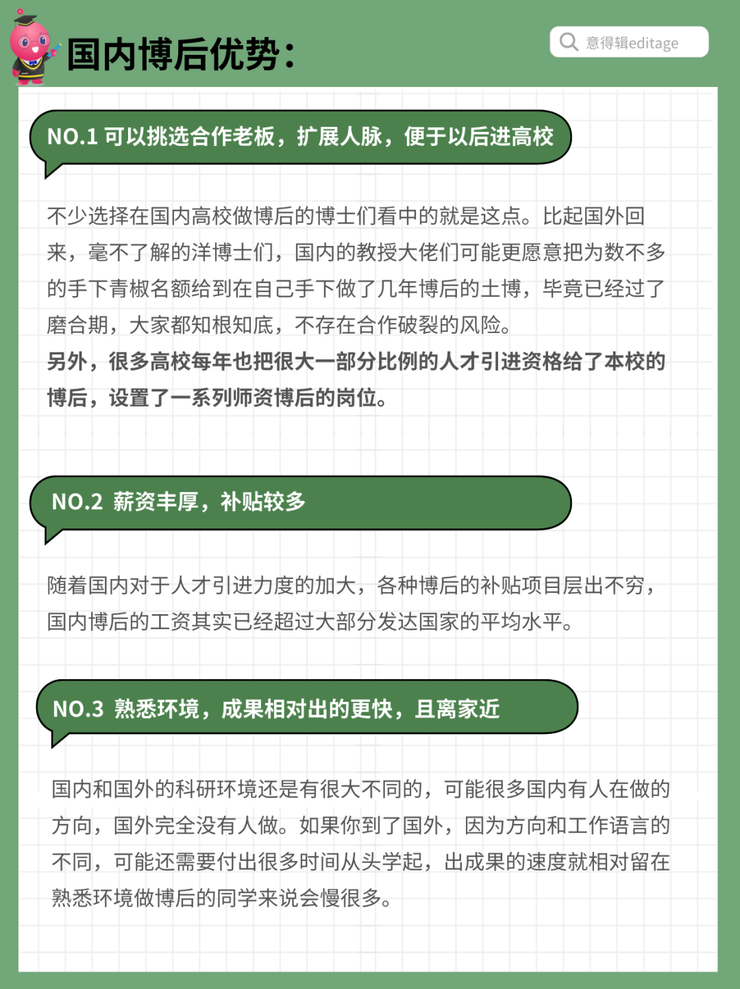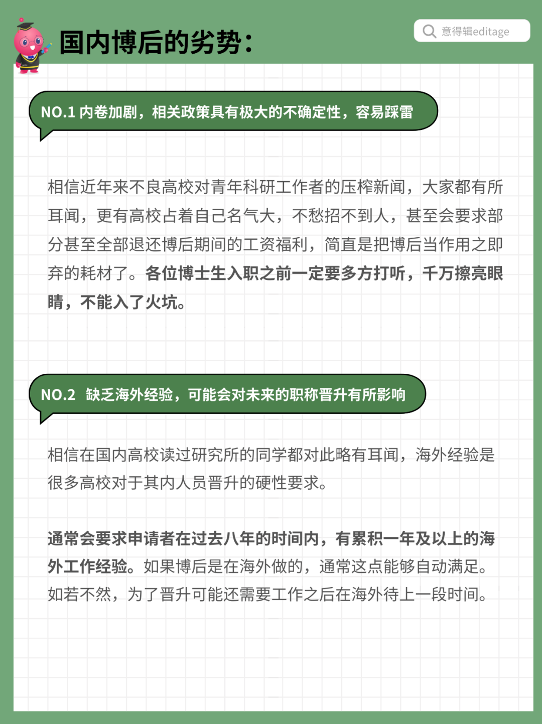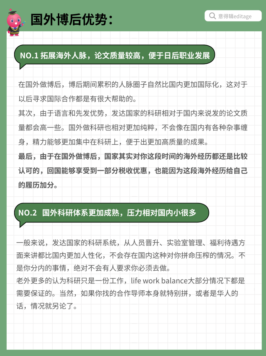 今天,小e就来盘点一下国内和国外做博后有哪些优点及缺点,供各位尚在选择纠结中的博士们一点参考👇👇