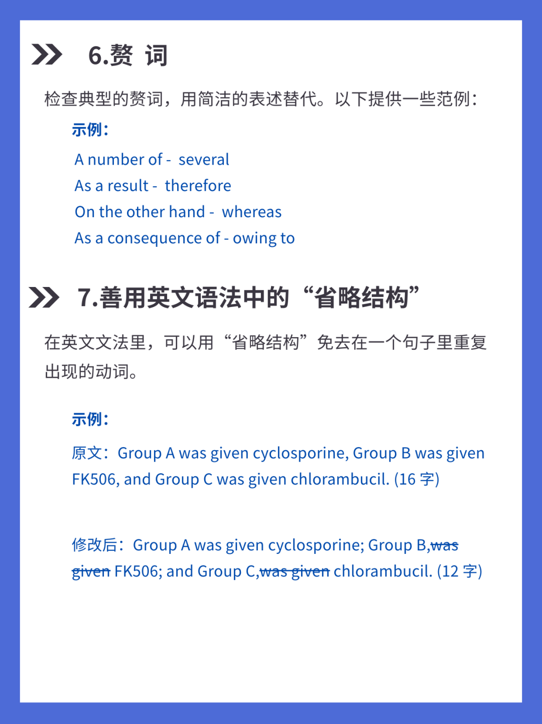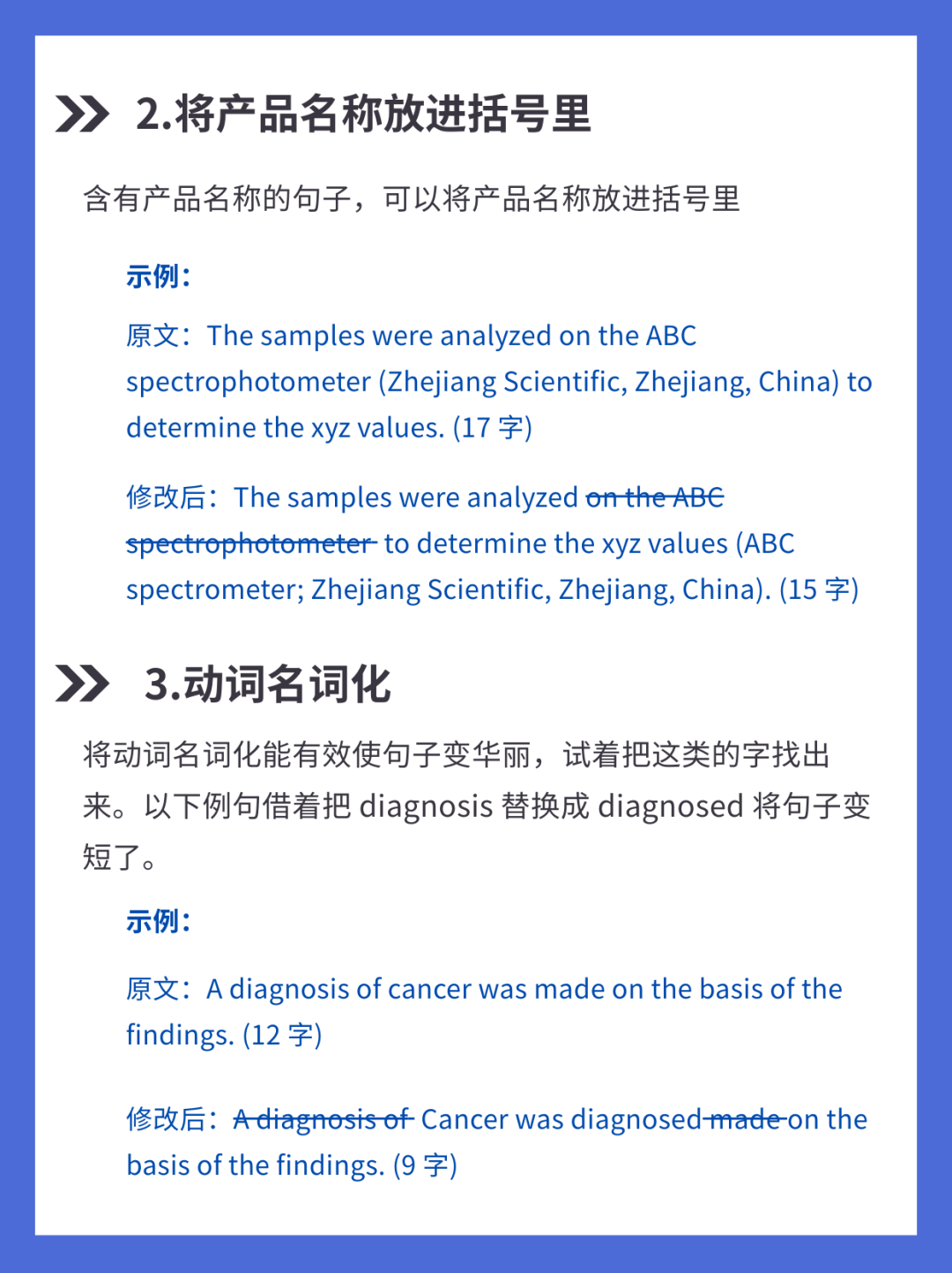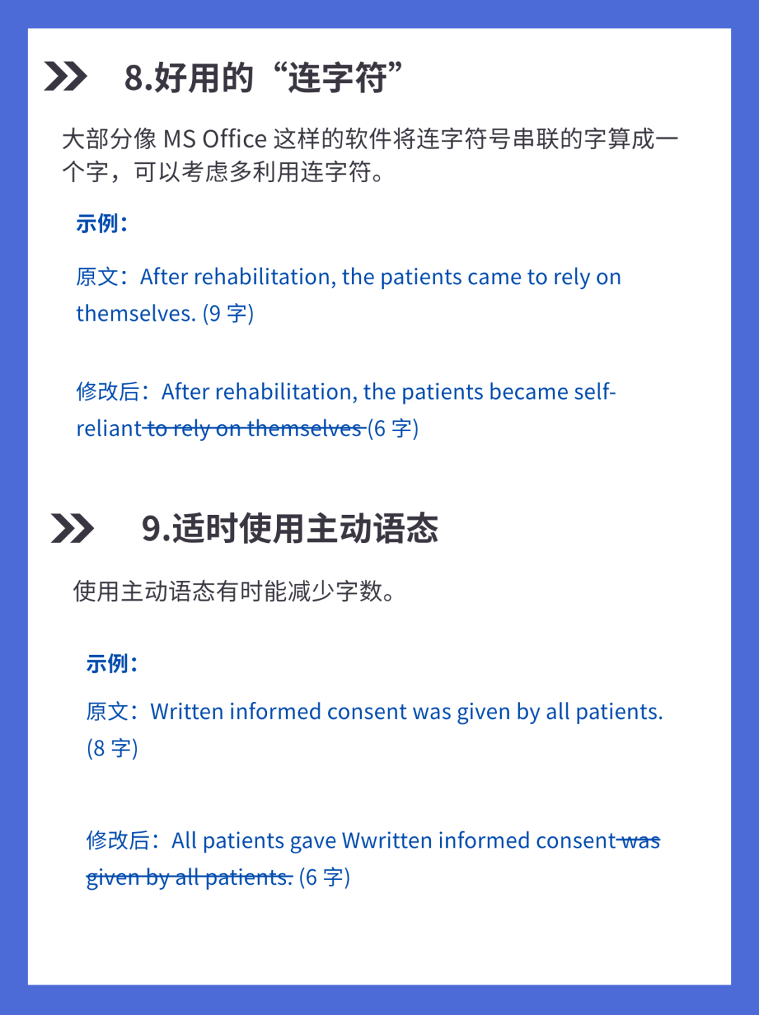 以上几个方法能在不改变原文的情况下,通过英文修改,大幅缩减文章长度,不过减少字数总归不是件简单的事,需要来回读过几遍才能把精简的部分找出来!