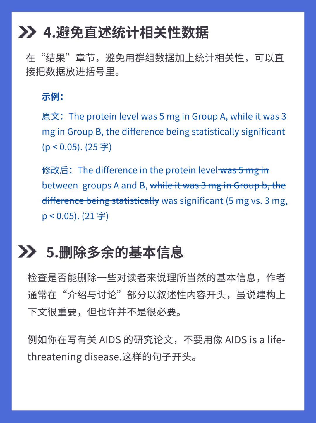 ✅删除多余的基本信息:检查是否能删除一些对读者来说理所当然的基本信息,作者通常在“介绍与讨论”部分以叙述性内容开头,虽说建构上下文很重要,但也许并不是很必要。
