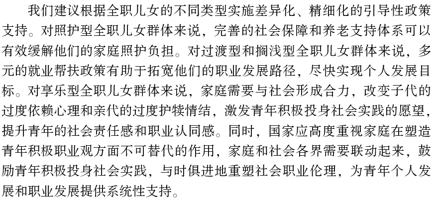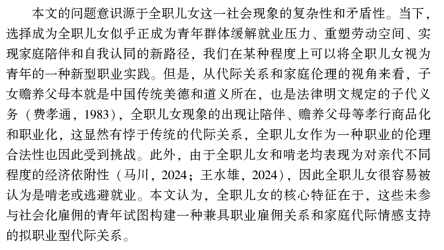 这篇论文很有意思,文章中提出——全职儿女的核心特征在于这些未参与社会化雇佣的青年试图构建一种兼具职业雇佣关系和家庭代际情感支持的拟职业型代际关系。